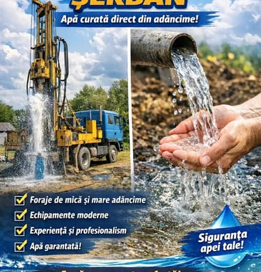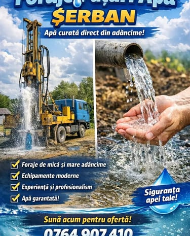 Executăm foraje puțuri în: - București - Ilfov (Voluntari, Pantelimon, Bragadiru, etc.) - Dolj (Craiova și localități din jur) Ne deplasăm rapid în raza de până la 100 km.